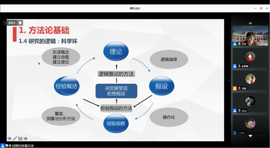 在方法论基础方面,田丽教授系统地介绍了方法论的概念、方法论的演进、以及如何提出科学的问题、如何进行具体的研究设计等主要内容。其中,田教授还借助“科学环”对社会研究的逻辑过程进行了详细介绍。她指出,做研究首先应该具有问题意识,在研究问题提出时应注意区分科学问题与价值问题;其次,要思考其是否能回应社会关切或者符合理论发展需要,是否具有创新性和可行性;最后,要注意根据研究问题选择研究方法,再根据研究方法来选择研究工具。只有厘清自己的研究问题、研究方法及具体研究工具,才能更好地服务于研究设计的落地。