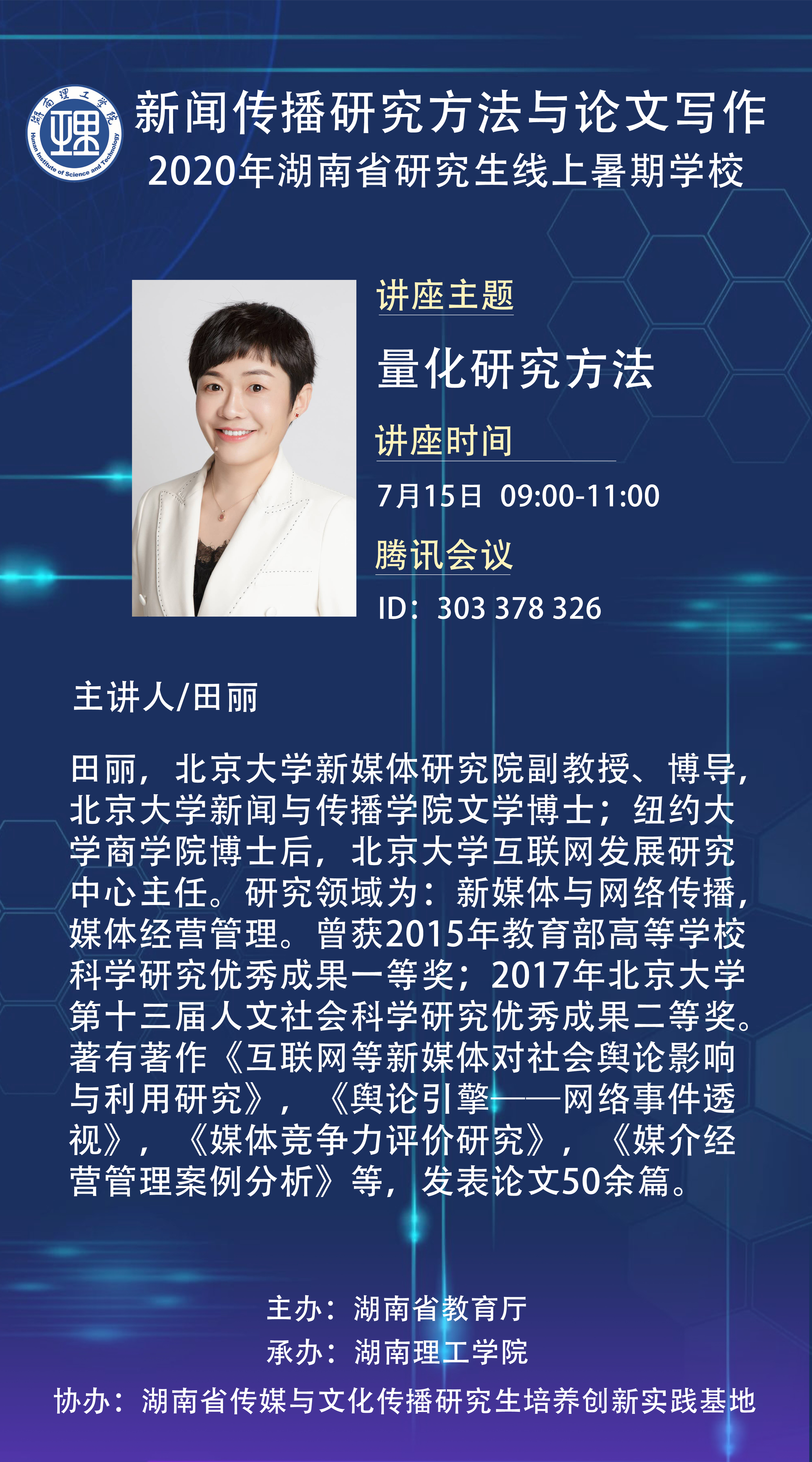 7月15日上午九点,北京大学新媒体研究院副教授、博士研究生导师、北京大学互联网发展研究中心主任田丽教授应邀参加2020年湖南省研究生线上暑期公司,为大家带来了“新闻学研究方法之量化研究”专题讲座。来自全国各地共300多名研究生和部分青年教师通过腾讯会议平台参加了此次线上学习活动,讲座由新闻传播院教师刘晶博士主持。