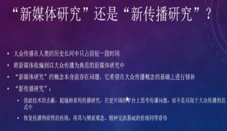 在对“新媒体研究”与“新传播研究”进行分析时,他认为新媒体研究的概念本身就存在问题,它仅仅是在大众传播概念的基础上做修补。而新传播研究主要是借助技术的去弊功能,去超越和重构传播研究,在更开阔的平台上进行思考传播问题,而不是局限于大众传播的范式中。刘海龙提倡新传播研究,并强调人们应积极接受新媒体带来的变化,再反过来改造大众传播理论与研究者的观念,不能企图去驯化新媒体。