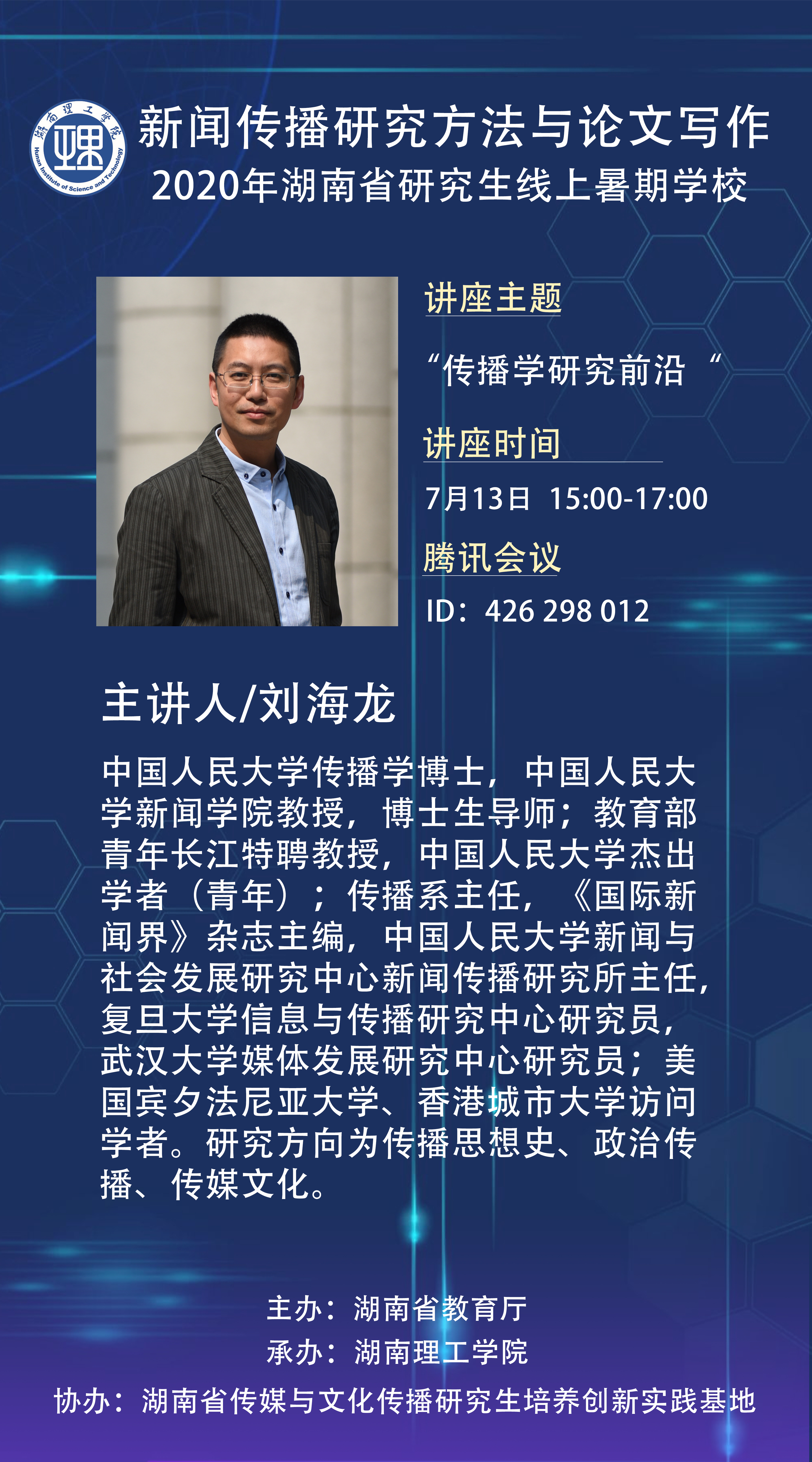 713下午15时国际新闻界主编、中国人民大学beats365博士生导师刘海龙应邀为2020年湖南省研究生线上暑期公司进行学术讲座,开展“传播学研究前沿”的主题分享,本次讲座由来自全国各地共300名师生通过腾讯会议平台进行线上聆听,由beats365副经理罗洪程主持。