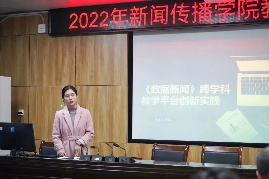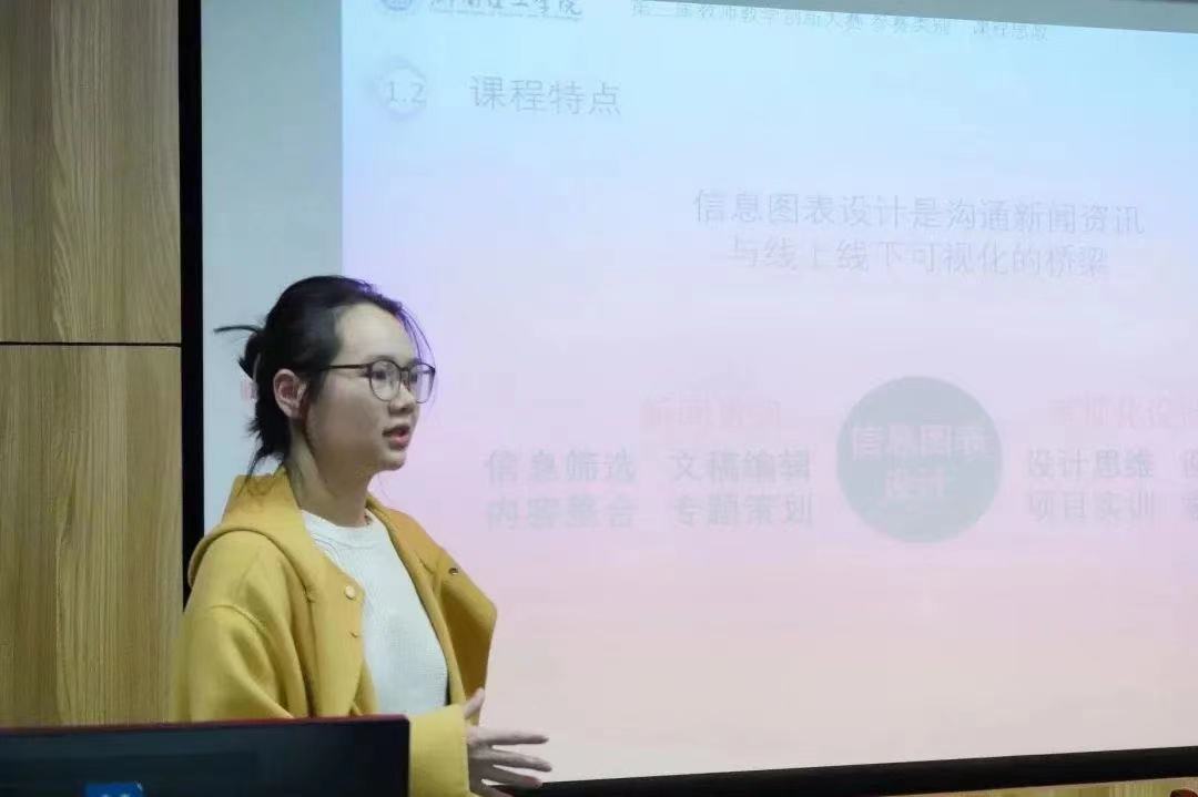 杨珊老师、侯雨薇老师分别从课程概述、教学方法、创新思路、教学创新成效等方面对“《数据新闻》跨学科教学平台创新实践”、“以‘思’为靶点的‘一链三合’创新教学设计”进行展示。