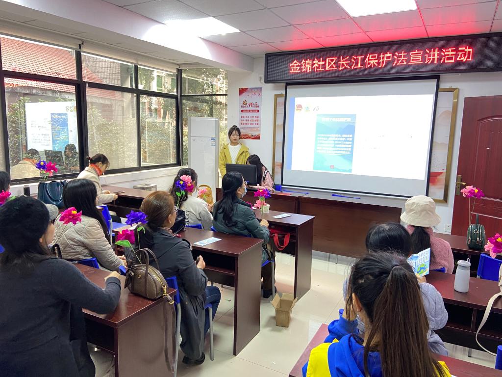 “阿姨,您了解《长江保护法》吗?”在社区街道,志愿者们向周围店铺发放宣传手册,介绍《长江保护法》的相关内容以及水域环境保护的重要意义,号召居民们增强法律意识,坚持“绿水青山就是金山银山”的生态理念,守护一江碧水。宣讲会上,志愿者们通过PPT的形式向社区居民集中讲解《长江保护法》,与现场居民进行互动。