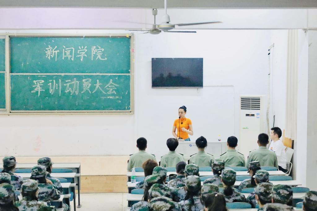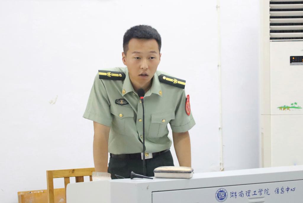 蒋宗智从仪容仪表、训练项目、公共秩序、寝室卫生、个人防护等方面介绍军训工作。(员工记者/胡涛 责编/张政 主审/肖涛 终审/方庭)