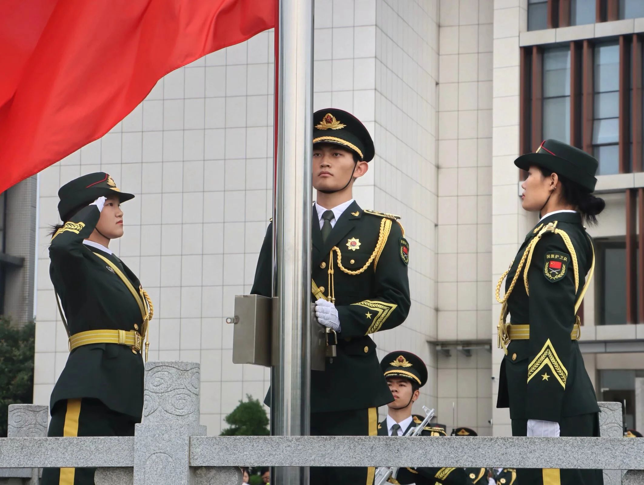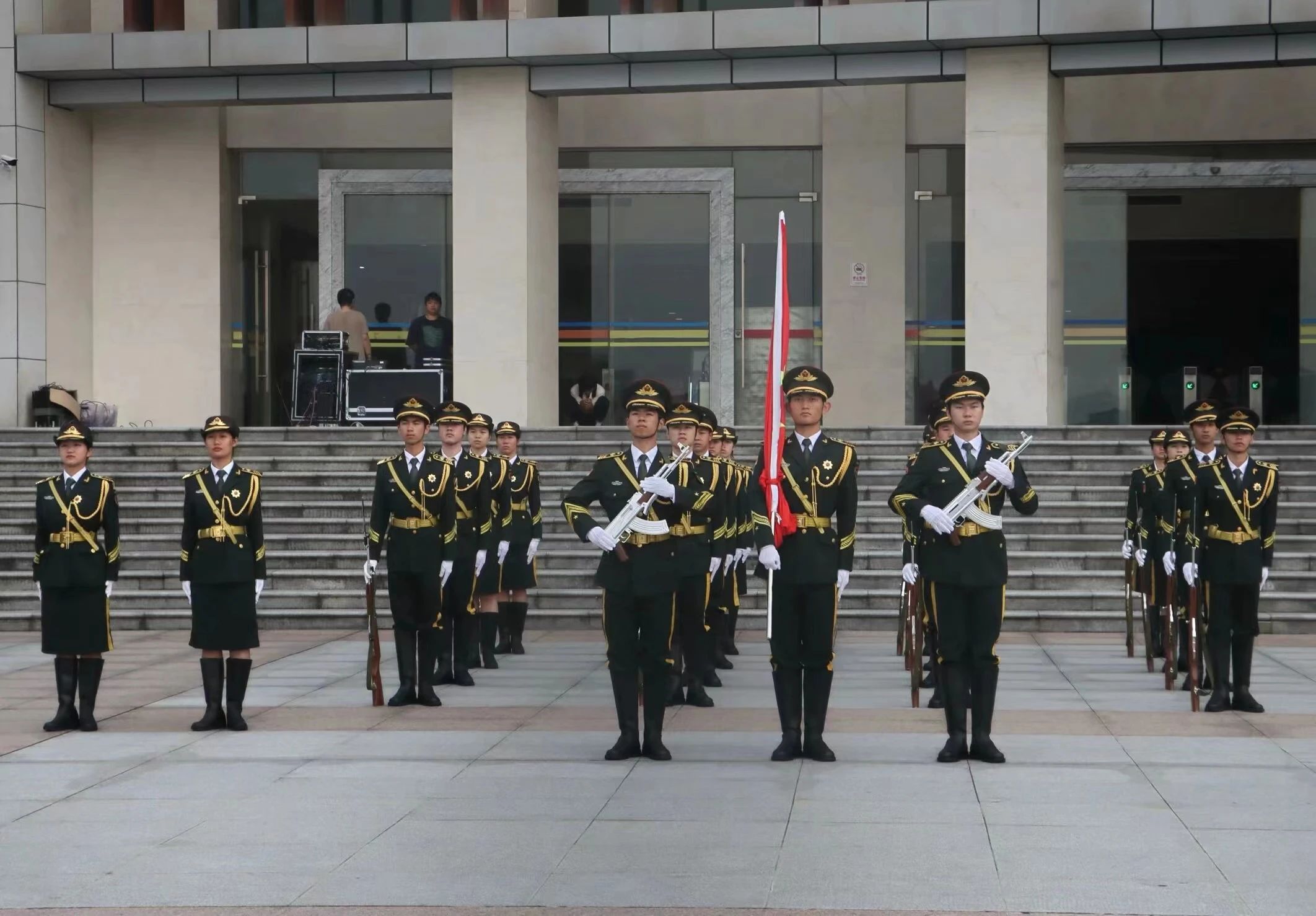 旭日东升,国旗仪仗队沐浴在金色的阳光下,迈着整齐划一、铿锵有力的步伐,护送着五星红旗正步走向升旗台。国歌响起,五星红旗徐徐升起,迎风飘扬。全体师生肃立,行注目礼。