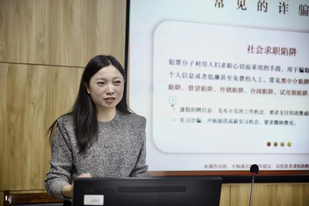 随后,贺冬梅带来反诈知识宣讲。她结合真实案例拆解常见诈骗手段,普及金融安全常识,引导员工树立风险防范意识,助力筑牢校园安全防护网。