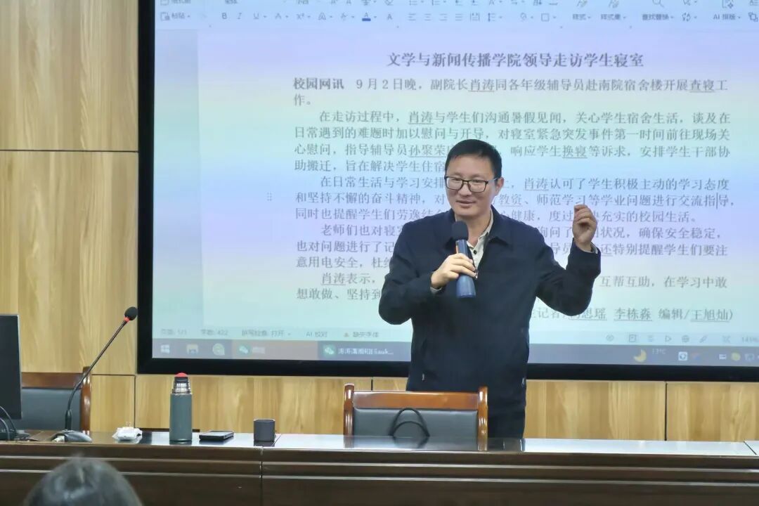 肖涛以往期稿件为案例,围绕如何撰写高质量新闻稿展开指导。他强调,新闻采写需严格遵循“五要素”规范,既要精准用词、聚焦核心信息,也要注重正能量传递与主题凝练;要通过现场观察、主动提问等方式丰富细节,增强稿件的真实感与现场感。肖涛表示,通讯社是连接新闻理论与实践的专业成长平台,鼓励同学们及时复盘不足、珍惜实践机会,在实操中提升专业能力。他同时提醒大家强化团队协作意识,以学习成长为核心参与社团活动。
