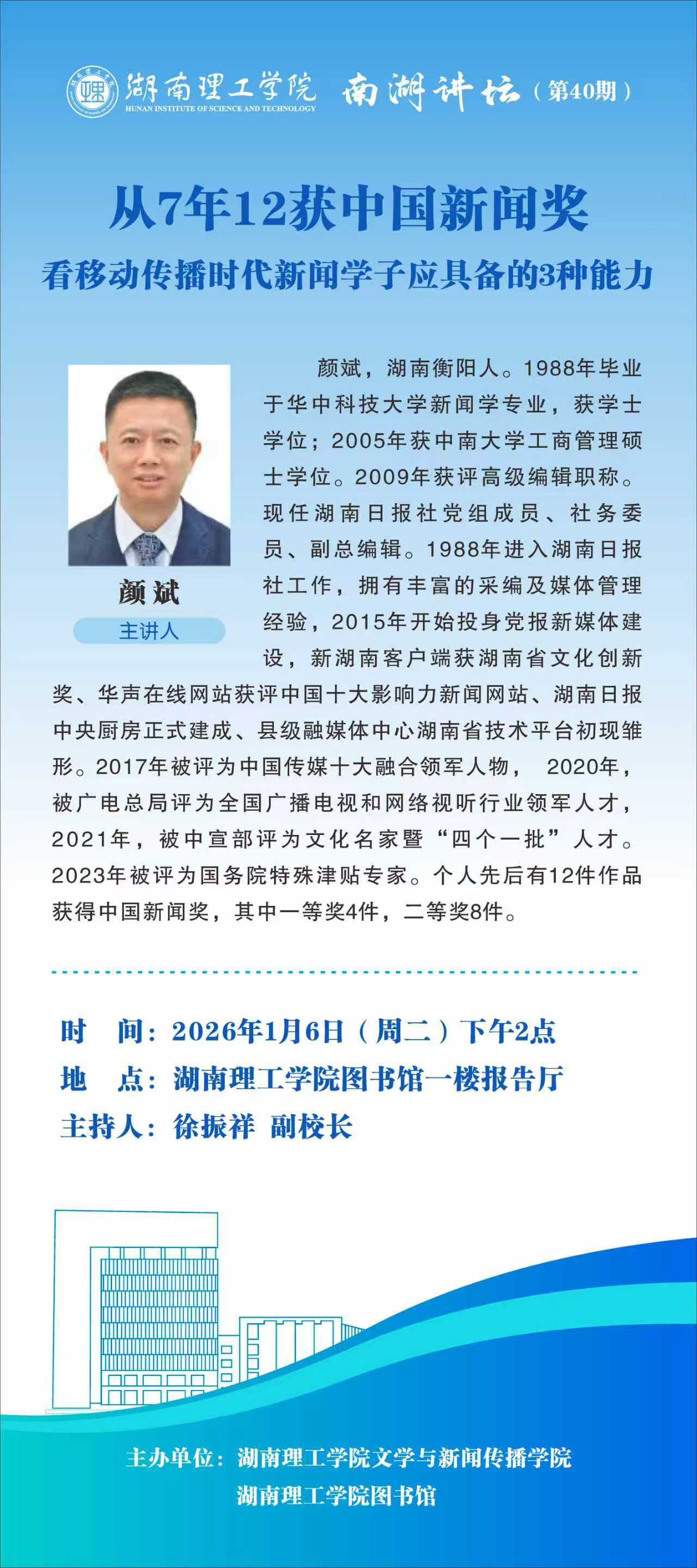 湖南日报社副总编辑颜斌“从7年12获中国新闻奖看移动传播时代新闻学子应具备的3种能力”讲座预告